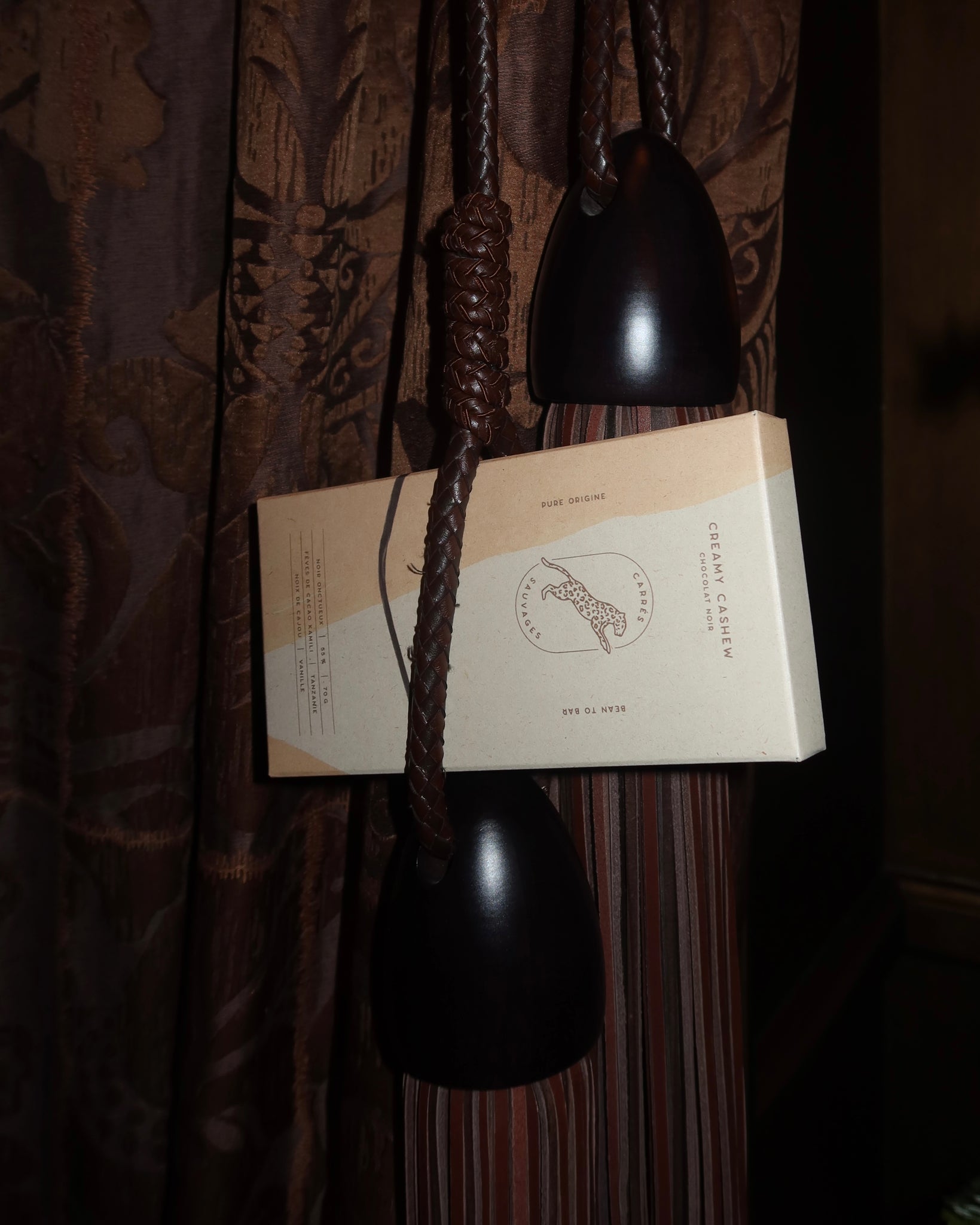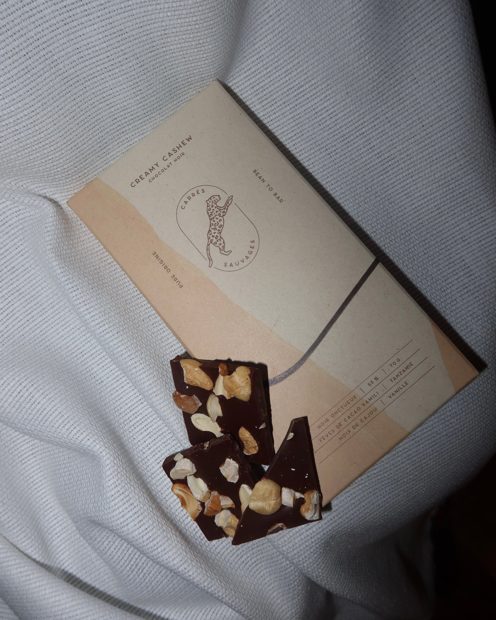 CREAMY CASHEW mêle fondant et croquant, puissance et tendresse. Voici le noir intense et fruité de la fève de Tanzanie enveloppé de douceur et de délicatesse par la noix de cajou et la vanille. Une texture velours, rehaussée d’éclats de noix de cajou et d’une fleur de sel.